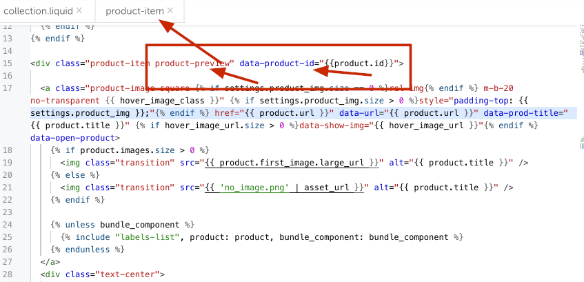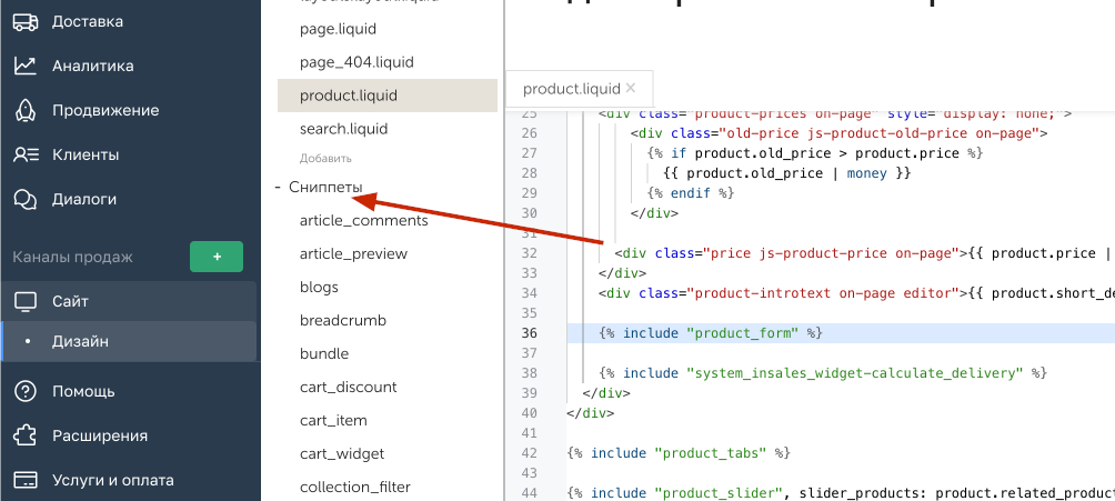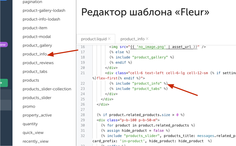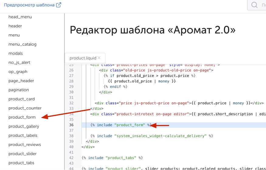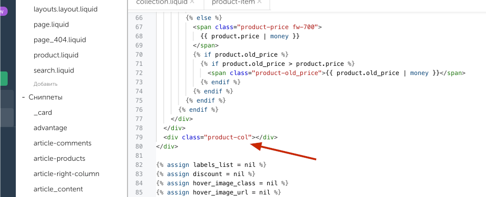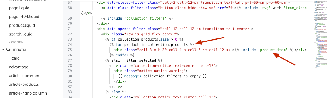 Для изменения кода товара открывает product.liquid
