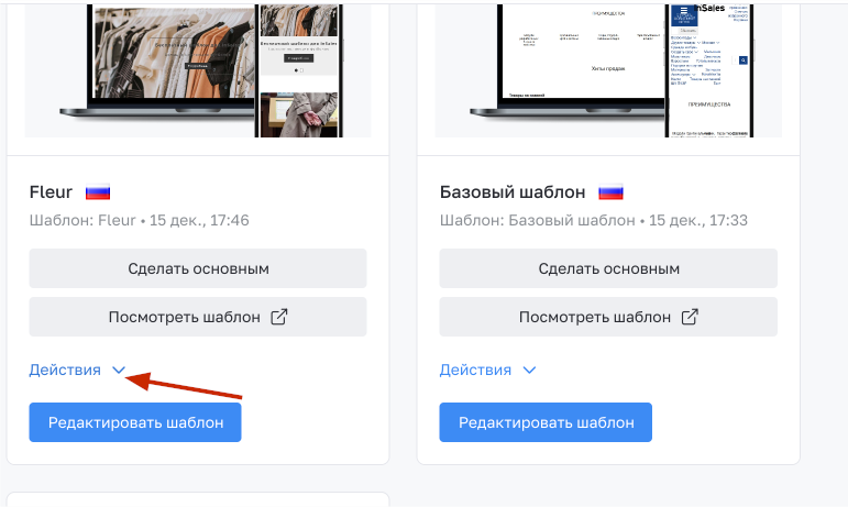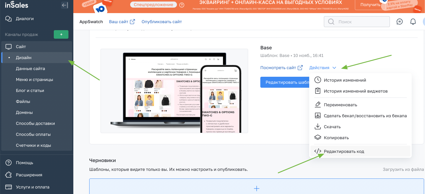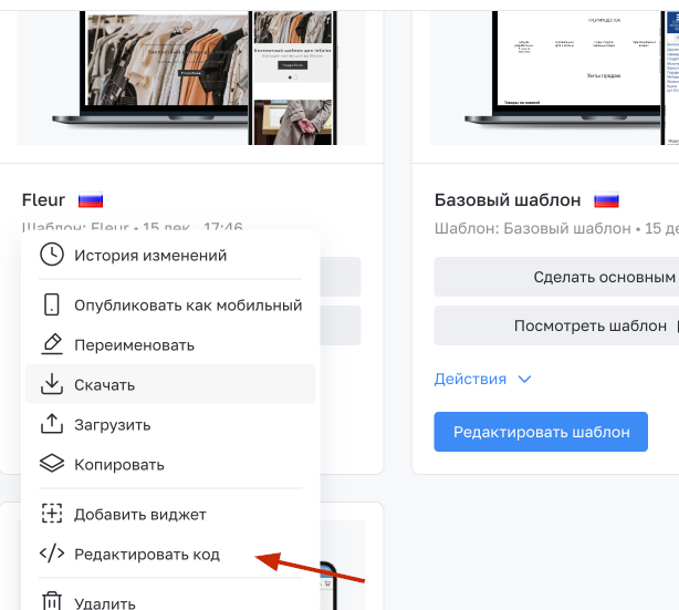Чтобы изменить код шаблона, нужно открыть редактор кода.