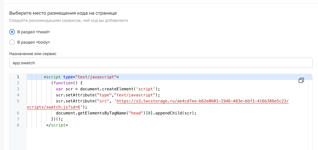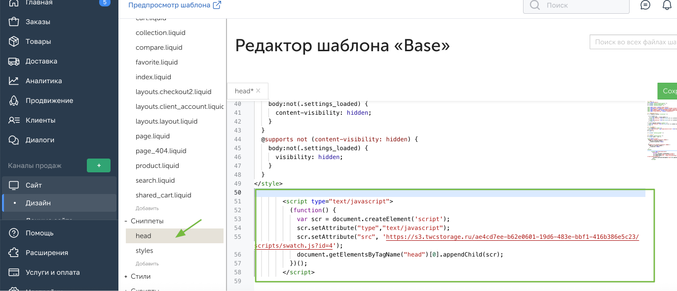 Оставляем выбранным “В раздел head” и вставляем скопированный код из приложения Настройки — InSales. Далее нажимаем “Сохранить””