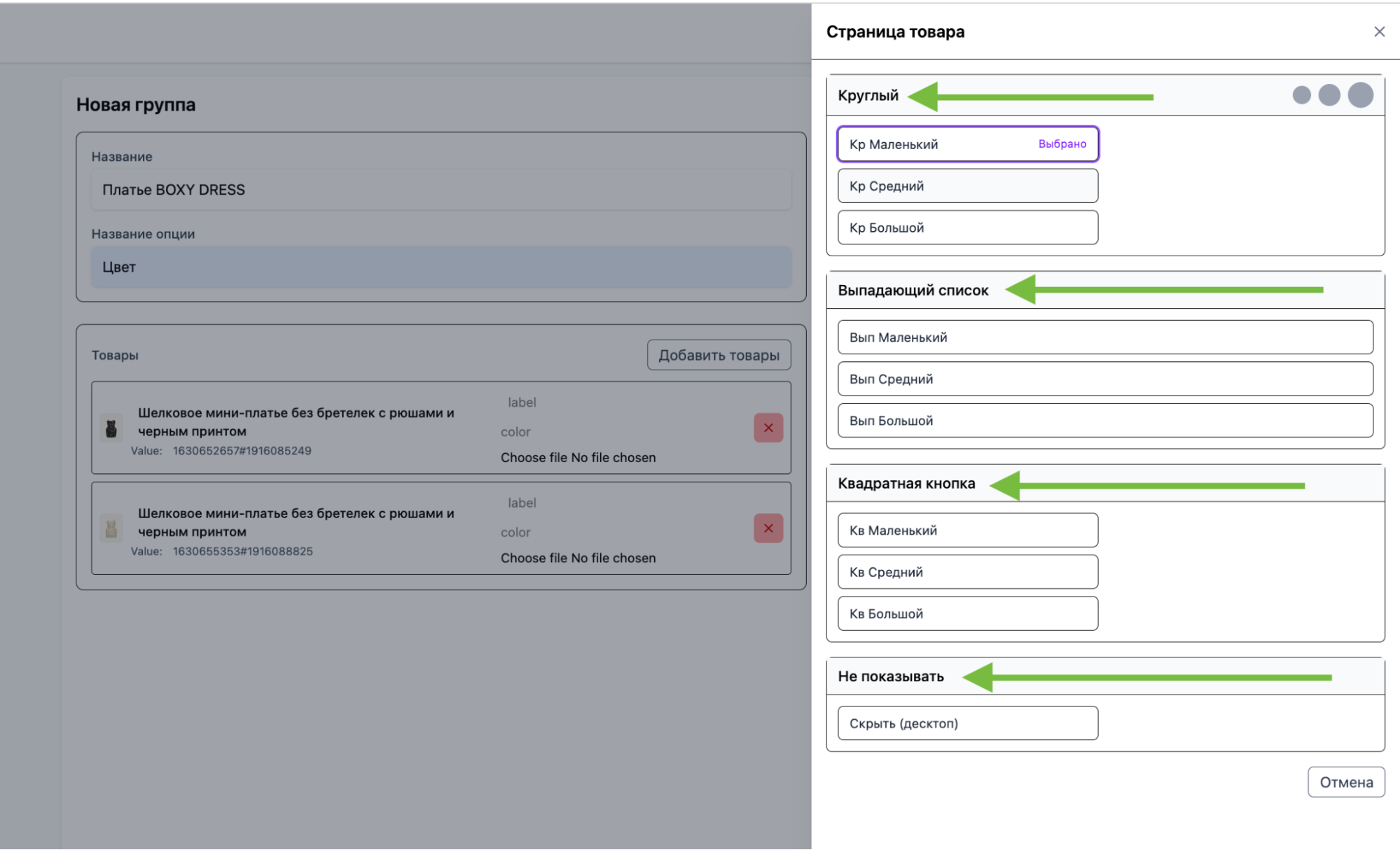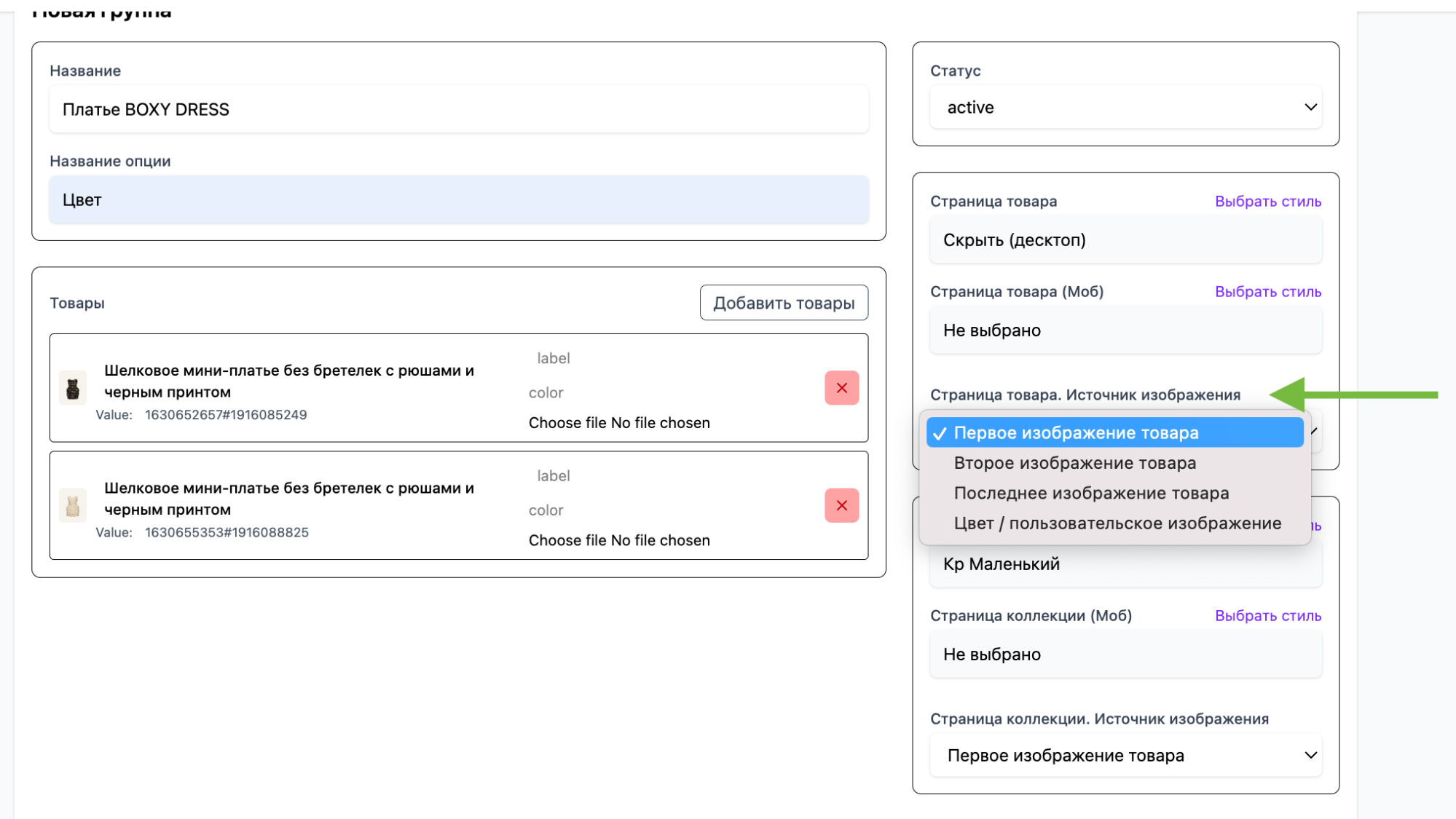 НАСТРОЙКА ОТОБРАЖЕНИЯ ВАРИАНТОВ И ЦВЕТОВ ТОВАРА НА ПРИМЕРЕ “ЦВЕТ”