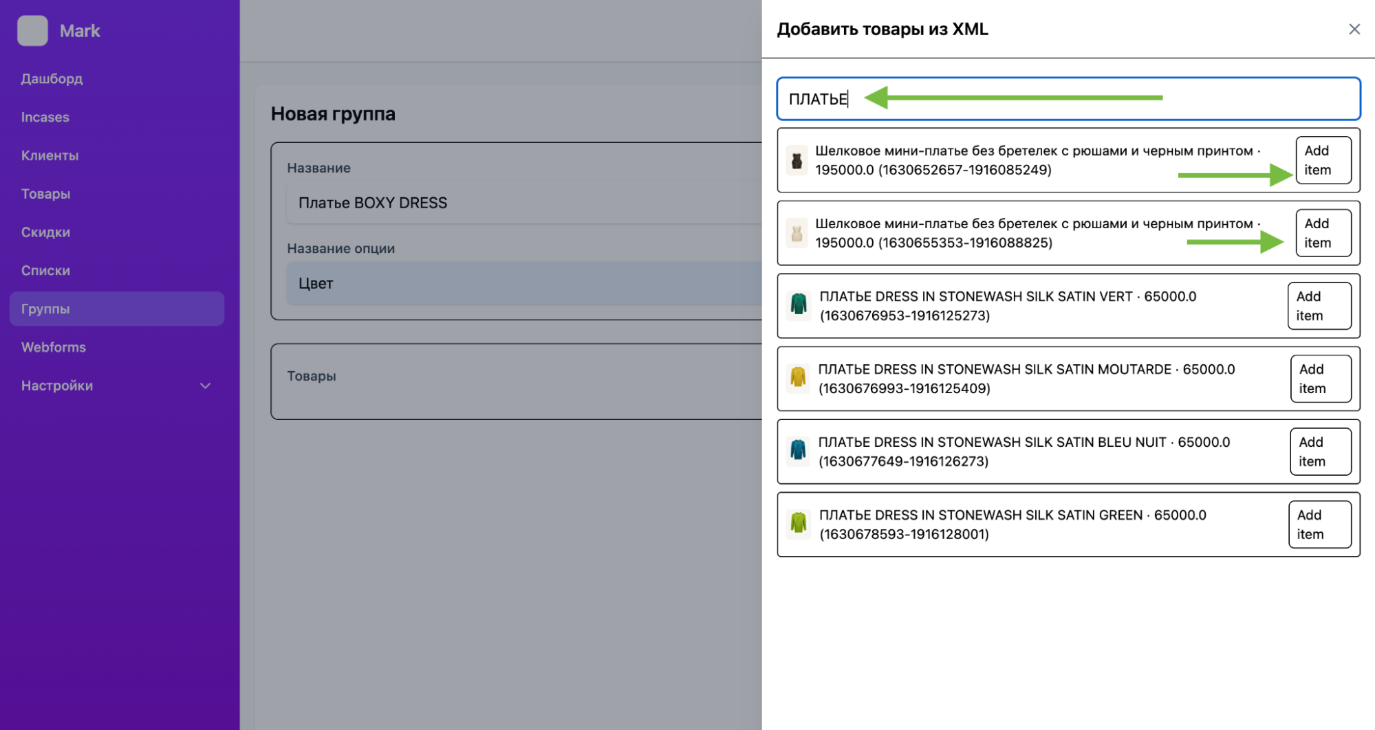 Введите артикул или название товара и добавьте их в группу ADD ITEM
