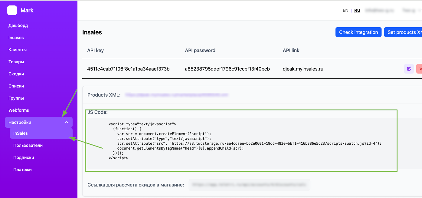 Если нужно, чтобы приложение заработало на всех темах, установленных в InSales, то вставляем этот код в бэк-офисе вашего аккаунта InSales в разделе “Сайт” - “Дизайн” - “Счетчики и Коды”