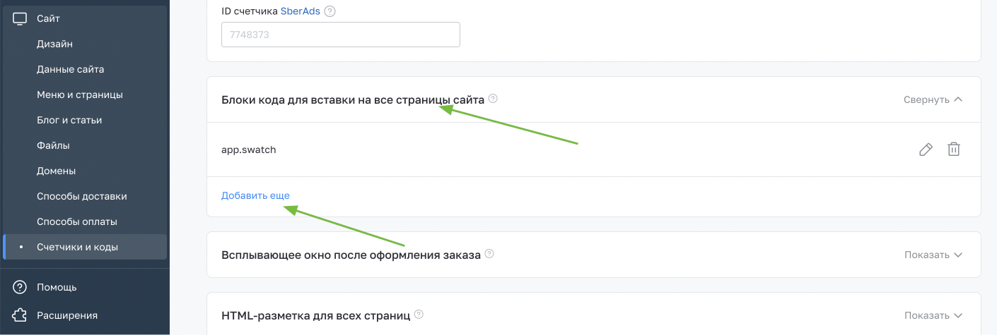 Выбираем “Блоки кода для вставки на все страницы сайта”