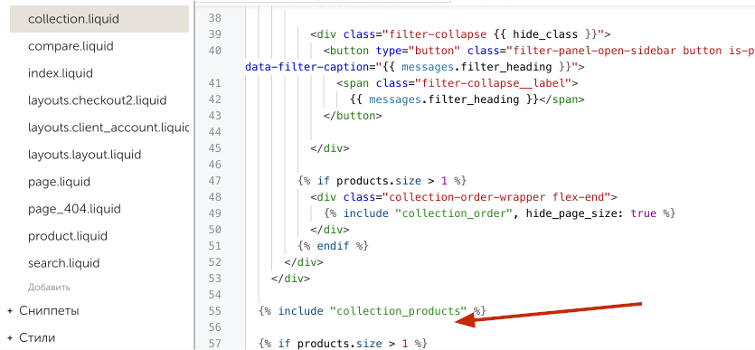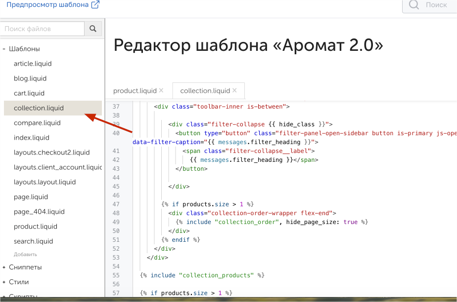 Для изменения кода категории открываем collection.liquid