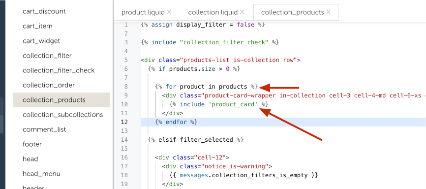 Ищем строку кода for product in collection.products или for product in products